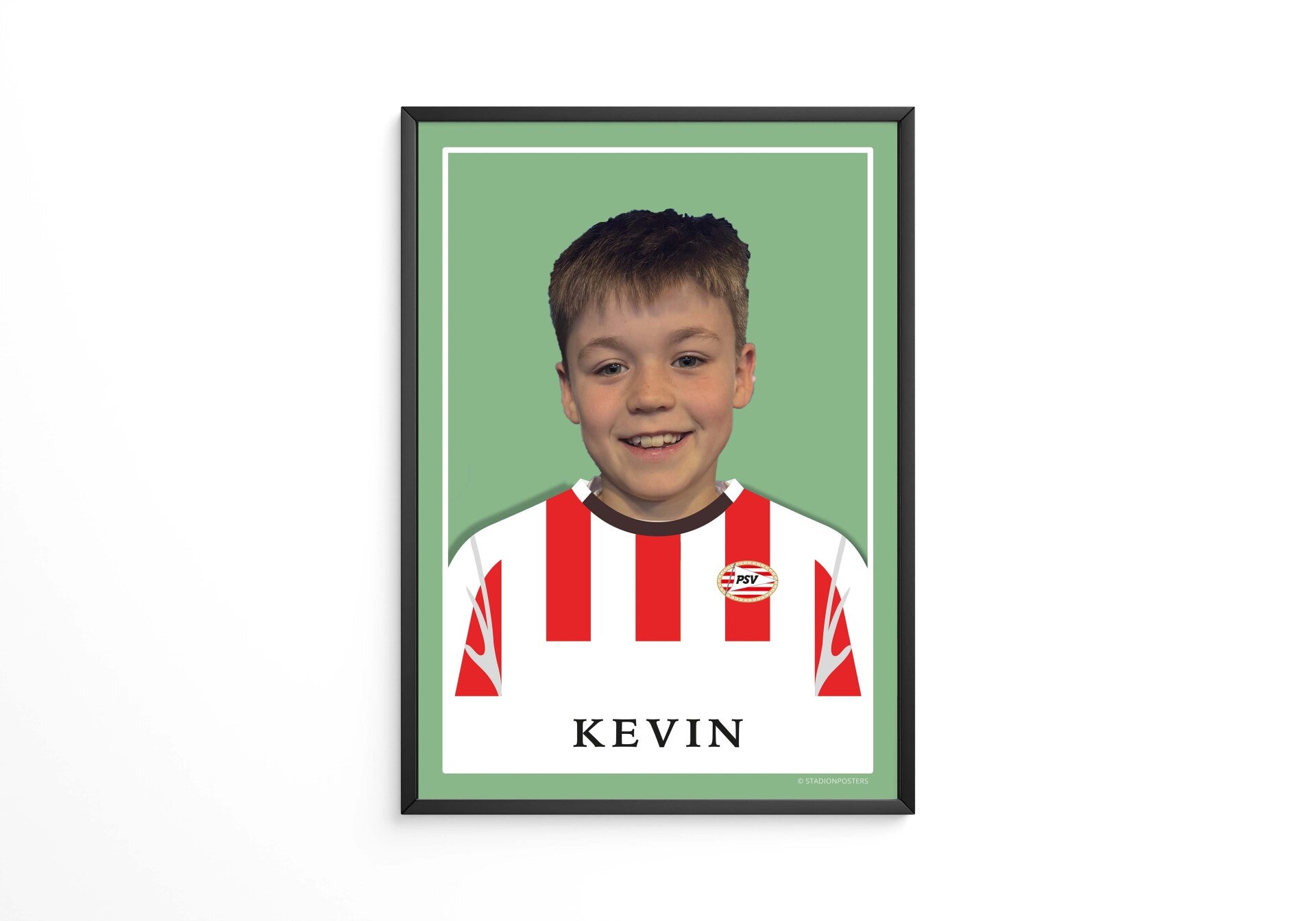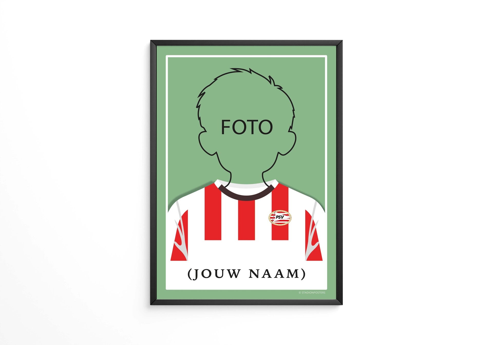 Maak een eigen PSV poster voor je zoon of dochter van het shirt van PSV met eigen naam.! Vul de naam in en creëer een unieke, gepersonaliseerde poster van de favoriete voetbalclub van je zoon of dochter – perfect voor aan de muur van hun slaapkamer!